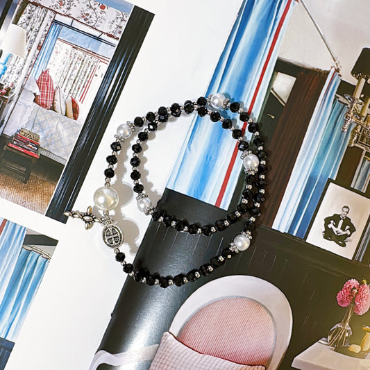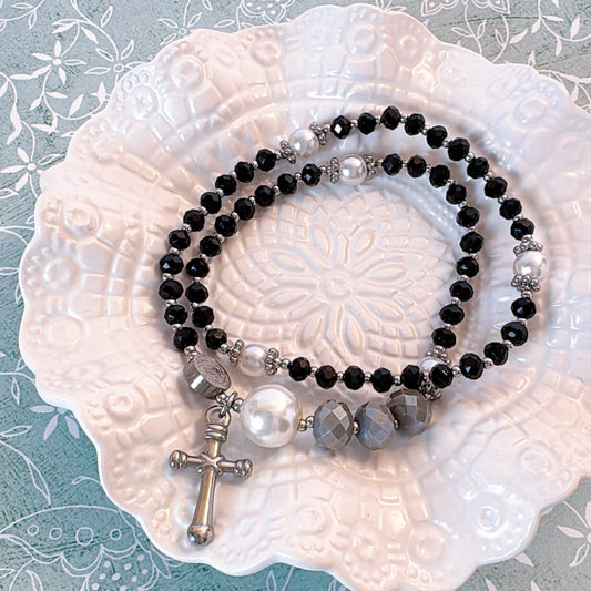 Black & Grey Crystals with Stainless Steel Cross Rosary Bracelet