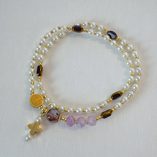 Pearl Beads with Purple Gemstones Rosary Bracelet