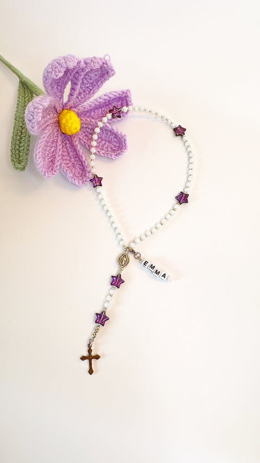 White Crystal & Purple Star Beads Rosary | Custom Name Tag Option (up to 10 characters)
