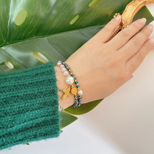 Metal Green Crystals with Pink Gemstones Rosary Bracelet