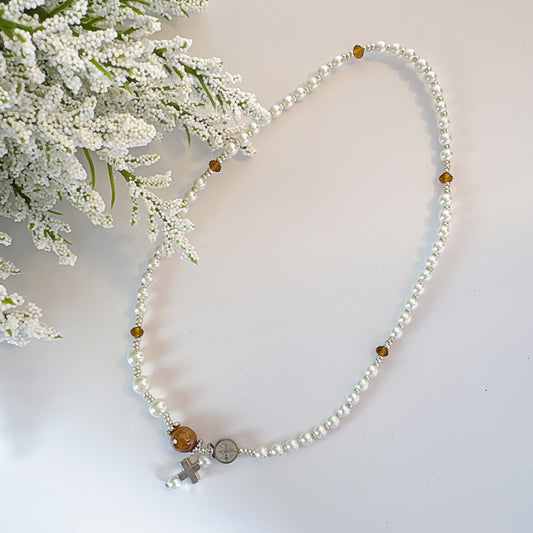 Pearl Beads & Brown Crystal Rosary Bracelet