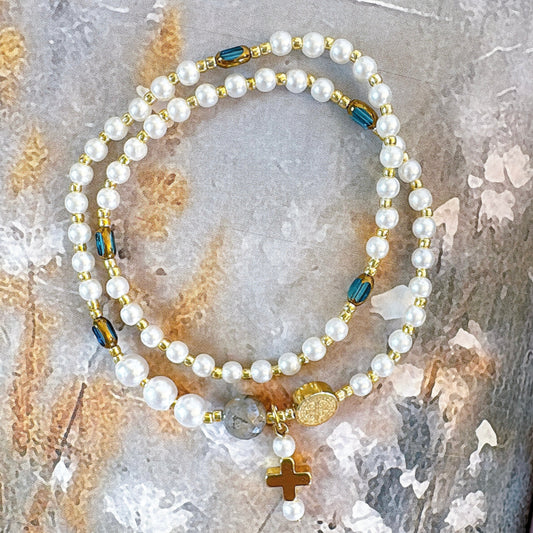 Pearl Beads with Clear Blue Crystals Rosary Bracelet
